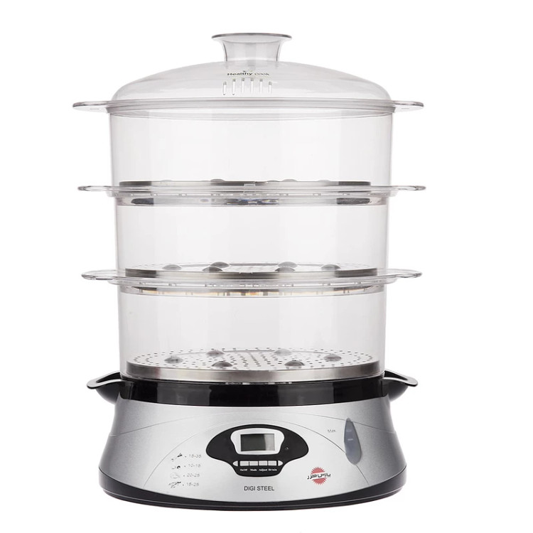بخارپز پارس خزر مدل دیجی استیل دستگاهی مناسب برای افرادی است که می خواهند غذای سالم و بدون روغن بخورند. این دستگاه برای تهیه مخلفات کنار غذاهای گوناگون هم کاربرد دارد. تهیه هویج پخته، سبزیجات مختلف، سیب زمینی پخته و ... با این محصول بسیار آسان است. توان بالای دستگاه آب را سریع به بخار تبدیل کرده و بخار داغ از میان طبقات و مواد غذایی مختلف عبور کرده و باعث پخت آنها می شود. وزن دستگاه کم است و ظرفیت بالایی دارد، همچنین در حین فعالیت و در میانه پخت هم می توان مقدار آب باقی مانده در دستگاه را از طریق نشانگر میزان آب کنترل کرد و در صورت نیاز به دستگاه آب اضافه کرد. پنل تنظیم دستگاه شامل دکمه ها و نمایشگر در جلوی آن قرار دارد تا از طریق آن تنظیم مربوط به مواد غذایی انتخاب و تعیین شود. طبقات را می توان روی هم قرار داد و از طرفیت کامل دستگاه بهره برد و در صورتی که مواد غذایی کم هستند می توان طبقات اضافی را از روی دستگاه برداشت . این مدل مجهز به 3 سینی از جنس استیل ضدزنگ نیز هست. بخارپز پارس خزر مدل دیجی استیل ﻣﺠﻬﺰ ﺑﻪ ﺳﻴﺴﺘﻢ ﺍﻳﻤﻨﻲ ﻗﻄﻊ ﺍﺗﻮﻣﺎﺗﻴﻚ ﺩﺭ ﺻﻮﺭﺕ ﺍﺗﻤﺎﻡ ﺁﺏ ﻣﺨﺰﻥ است تا به این ترتیب دستگاه ایمن بوده و خطری ایجاد نشود. پارس خزر تولید و عرضه کننده لوازم خانگی برقی است که به خوبی شناخته شده است و گزینه ای مناسب پیش روی خریداران محسوب می شود.