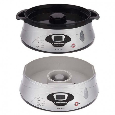 بخارپز پارس خزر مدل دیجی استیل دستگاهی مناسب برای افرادی است که می خواهند غذای سالم و بدون روغن بخورند. این دستگاه برای تهیه مخلفات کنار غذاهای گوناگون هم کاربرد دارد. تهیه هویج پخته، سبزیجات مختلف، سیب زمینی پخته و ... با این محصول بسیار آسان است. توان بالای دستگاه آب را سریع به بخار تبدیل کرده و بخار داغ از میان طبقات و مواد غذایی مختلف عبور کرده و باعث پخت آنها می شود. وزن دستگاه کم است و ظرفیت بالایی دارد، همچنین در حین فعالیت و در میانه پخت هم می توان مقدار آب باقی مانده در دستگاه را از طریق نشانگر میزان آب کنترل کرد و در صورت نیاز به دستگاه آب اضافه کرد. پنل تنظیم دستگاه شامل دکمه ها و نمایشگر در جلوی آن قرار دارد تا از طریق آن تنظیم مربوط به مواد غذایی انتخاب و تعیین شود. طبقات را می توان روی هم قرار داد و از طرفیت کامل دستگاه بهره برد و در صورتی که مواد غذایی کم هستند می توان طبقات اضافی را از روی دستگاه برداشت . این مدل مجهز به 3 سینی از جنس استیل ضدزنگ نیز هست. بخارپز پارس خزر مدل دیجی استیل ﻣﺠﻬﺰ ﺑﻪ ﺳﻴﺴﺘﻢ ﺍﻳﻤﻨﻲ ﻗﻄﻊ ﺍﺗﻮﻣﺎﺗﻴﻚ ﺩﺭ ﺻﻮﺭﺕ ﺍﺗﻤﺎﻡ ﺁﺏ ﻣﺨﺰﻥ است تا به این ترتیب دستگاه ایمن بوده و خطری ایجاد نشود. پارس خزر تولید و عرضه کننده لوازم خانگی برقی است که به خوبی شناخته شده است و گزینه ای مناسب پیش روی خریداران محسوب می شود.