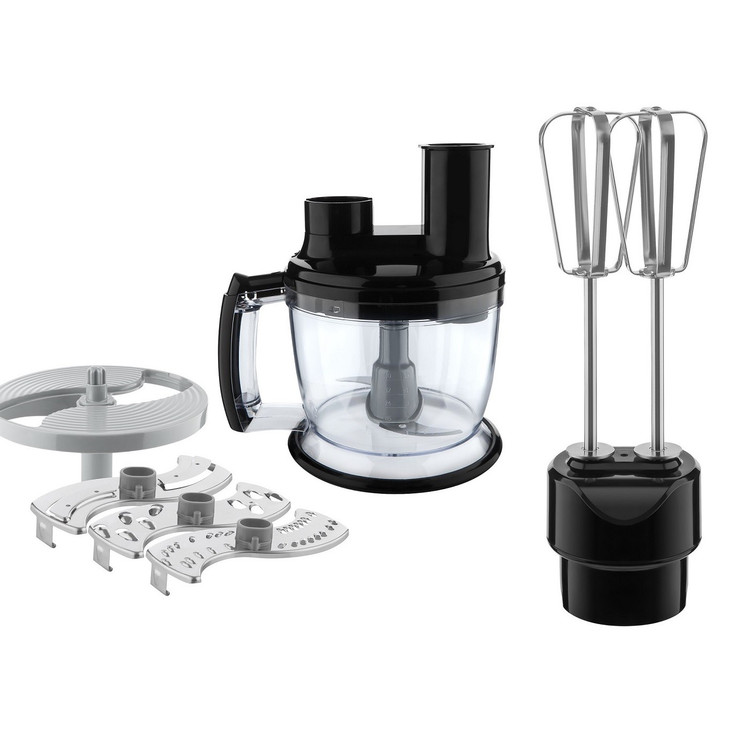 یک لیوان 0.8 لیتری به همراه گوشت کوب برقی 9 کاره سنکور وجود دارد که از جنس تریتان درجه یک میباشد. همچنین به همراه آن یک ظرف غذاساز نیز وجود دارد که حجمی برابر با 1.25 لیتر دارد. این دستگاه کارایی هایی از قبیل همزدن انواع سس و خمیر، ,خردکردن خشکبار و اجیل، ریز و ورقه کردن میوه ها، مخلوط کردن مواد غذایی، خردکردن سبزیجات و رنده کردن را دارد. ظرف خردکن نیز همانند ظرف غذاساز از جنس پلاستیک درجه یک بوده و 0.5 لیتری میباشد.